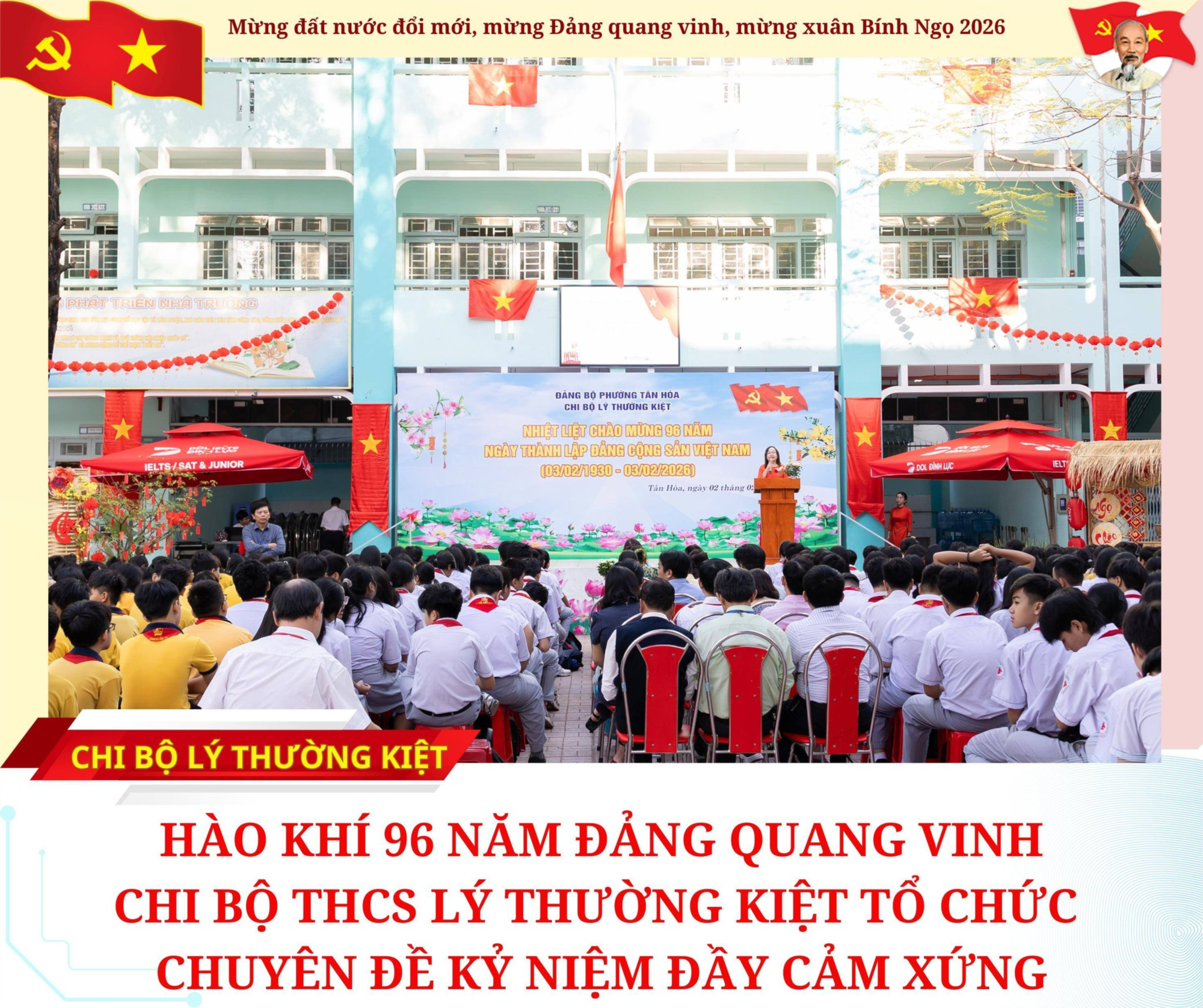 Trong không khí rộn ràng của những ngày đầu xuân Bính Ngọ, sáng 02/02/2026, Chi bộ trường THCS Lý Thường Kiệt đã long trọng tổ chức buổi sinh hoạt chuyên đề kỷ niệm 96 năm ngày thành lập Đảng Cộng sản Việt Nam (03/02/1930 – 03/02/2026). Với chủ đề "Củng cố niềm tin – Phát huy trách nhiệm – Mừng Đảng – Mừng Xuân", buổi lễ không chỉ là dịp ôn lại truyền thống hào hùng mà còn khơi dậy niềm tự hào và ý thức trách nhiệm trong mỗi cán bộ, giáo viên, nhân viên và học sinh nhà trường.