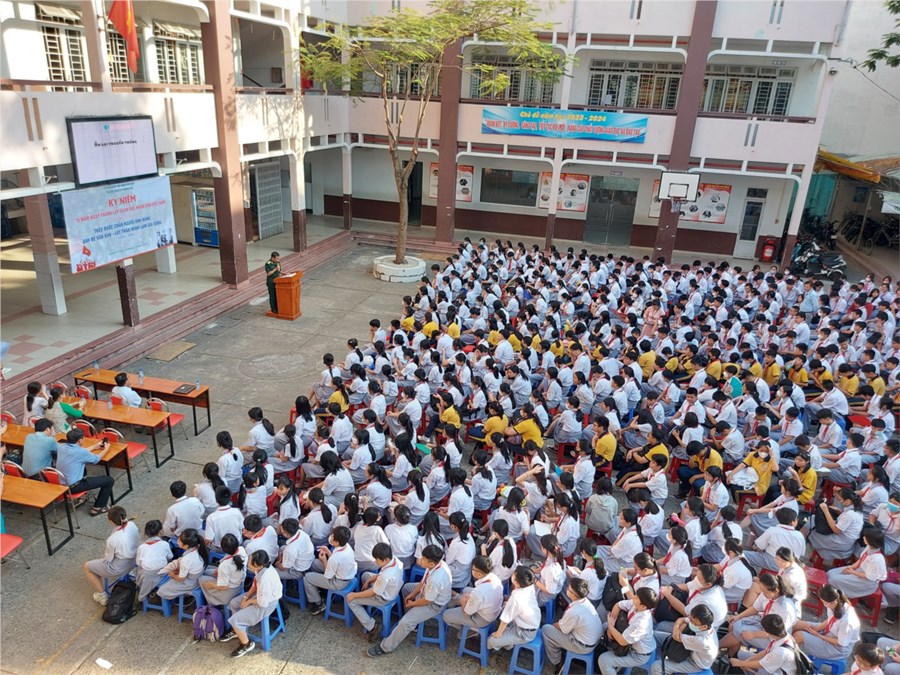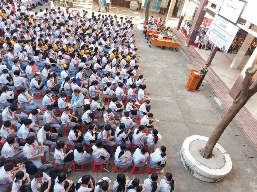 Trong buổi lễ, các em học sinh đã rất vinh dự được nghe bác Nguyễn Chính Ủy – Chủ tịch Hội Khuyến học (phường 9, quận Tân Bình) sinh hoạt ôn lại lịch sử ngày 22/12, những truyền thống vẻ vang, hào hùng, những chiến công oanh liệt của Quân đội nhân dân Việt Nam trong 79 năm xây dựng và trưởng thành. Để giành được độc lập, tự do như hôm nay, không biết bao nhiêu anh hùng, liệt sĩ đã anh dũng hi sinh. Hôm nay các em được sống trong hòa bình được hưởng cuộc sống ấm no là do sự hi sinh của các thế hệ đi trước, là bởi những chiến sĩ không sợ hi sinh, không ngại gian khổ để bảo vệ Tổ quốc. Các em cần ra sức học tập, rèn luyện, kế thừa con đường xây dựng quê hương đất nước ngày càng giàu mạnh để đền đáp công ơn, sự hi sinh của các thế hệ cha, anh.
