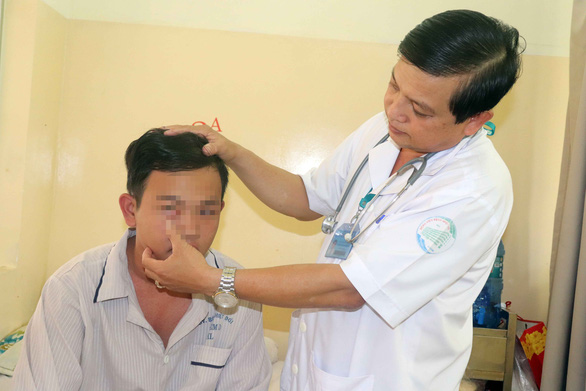 BS CKII Nguyễn Thanh Phong (Bệnh viện Bệnh nhiệt đới TP.HCM) đang khám cho cháu N.T.P. - Ảnh: X.MAI